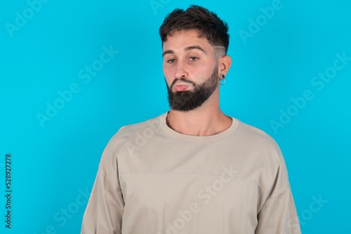 Dissatisfied bearded caucasian man wearing casual T-shirt over blue background purses lips and has unhappy expression looks away stands offended. Depressed frustrated model.