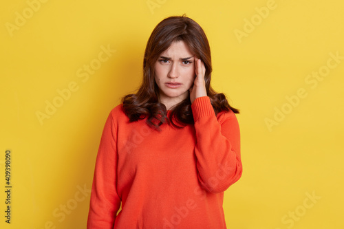 Distressed dark haired Caucasian woman touches temples and suffers migraine, has painful headache, frowns face, needs painkillers, wears in casual orange jumper, isolated over yellow background.