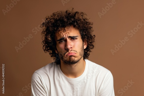 diverse guy looking disappointed with curly hair in white t shirt posing on brown wall minimal background with copy space with emotional facial expression