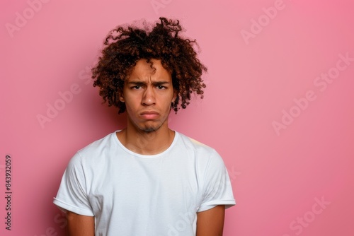 diverse millennial or gen z guy with curly hair looking disappointed or irritated wearing white t-shirt isolated on pink background mock up template