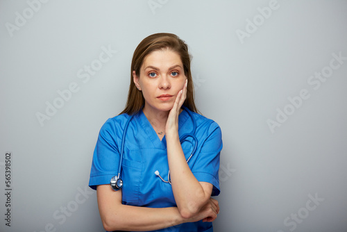Doctor or nurse in blue medical suit. Isolated portrait of woman medical worker.