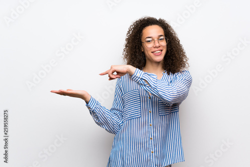 Dominican woman with striped shirt holding copyspace imaginary on the palm to insert an ad