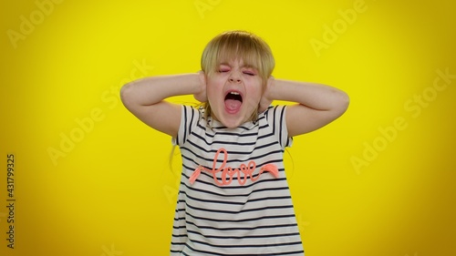 Dont want to hear and listen. Frustrated annoyed irritated blonde kid child 5-6 years old covering ears and gesturing no, avoiding advice ignoring unpleasant noise loud voices. Naughty teenager girl