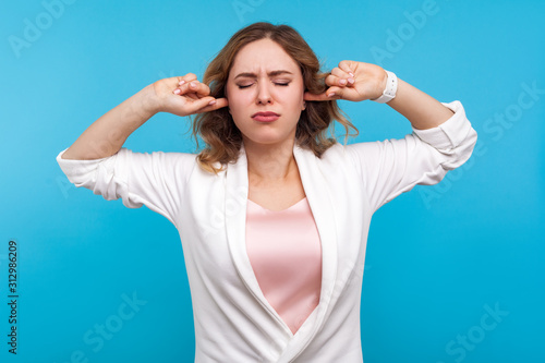Don't want to listen! Portrait of resentful girl with wavy hair in white jacket standing covering ears and closed eyes in displeasure, frustrated about what she hear, ignoring loud noise. studio shot