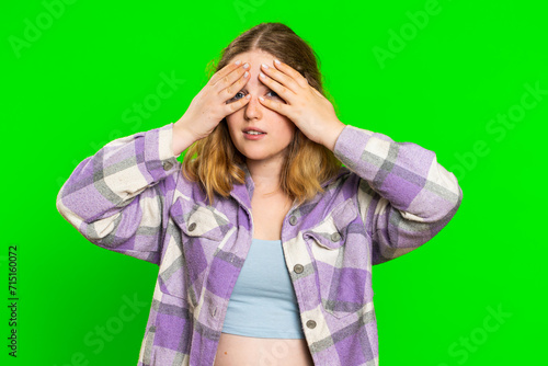 Dont want to look at this, awful. Afraid shocked caucasian woman closing eyes with hand showing stop gesture, confused shy scared reject to watch. Redhead girl isolated on green chroma key background