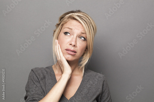 doubt and worry concept - confused 20s cute blond woman seeking for ideas or solutions with hand touching her face for reinsurance,gray background