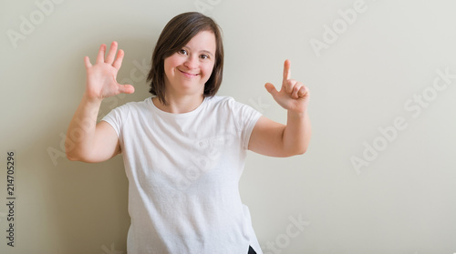 Down syndrome woman standing over wall showing and pointing up with fingers number seven while smiling confident and happy.
