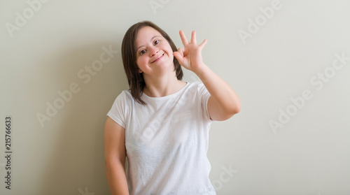 Down syndrome woman standing over wall smiling positive doing ok sign with hand and fingers. Successful expression.