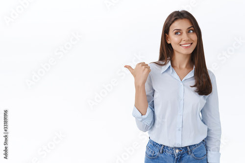 Dreamy and pleased young attractive woman found exactly what need, look and pointing left satisfied with delighted happy smile observe something cool, recommend product, white background