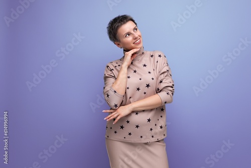 dreamy pretty young caucasian boss woman in skirt and blouse on background with copy space