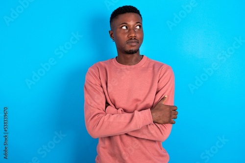 Dreamy rest relaxed young handsome man wearing pink sweater over blue background crossing arms, looks good copyspace