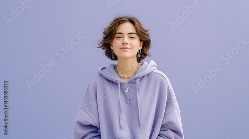 Dreamy Woman in Lavender Hoodie Walking Against Soft Purple Background