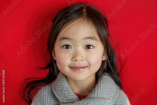 East Asian Little Girl isolated on a red Background Smiling Happy Playful Innocent Joyful Cheerful Child Portrait Studio Photography Youthful Bright