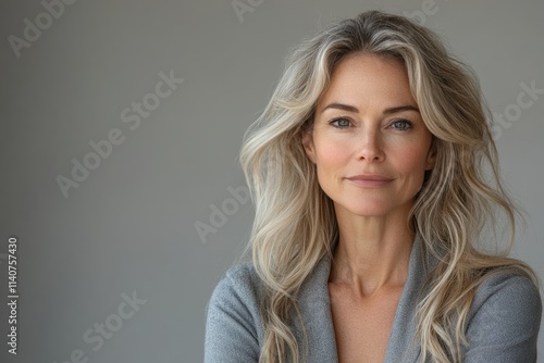 Eco-conscious branding photo of a middle-aged businesswoman, styled in minimalist sustainable corporate wear.