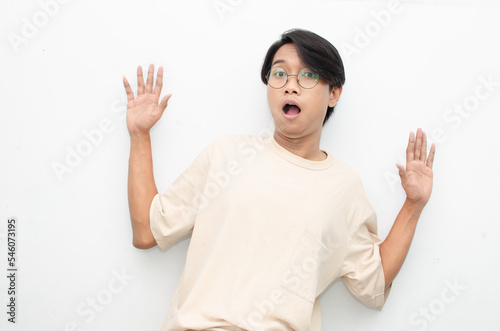 ecstatic attractive young asian man shocked happily opening mouth and lowering glasses. asian man with glasses feels shock with wow surprised expression.