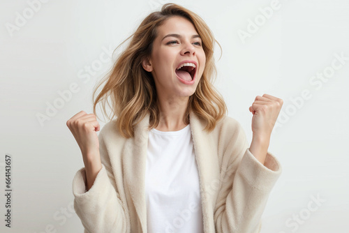Ecstatic Woman Celebrating with a Fist Pump: Winning the Lottery on a White Background
