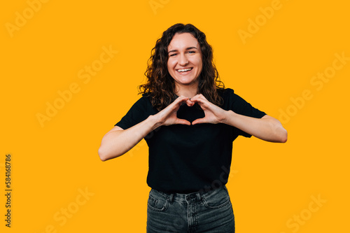 Ecstatic young woman shows love while making heart gesture over her chest.