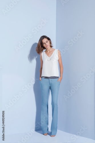 Editorial Photographic Women's Clothing, Professional Photos, Light Blue Background, Business Woman, Business Template.