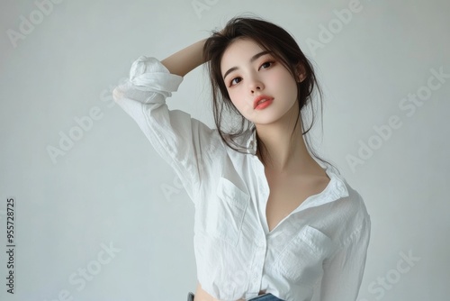 Effortless Elegance: A captivating portrait of a young woman with dark hair, exuding confidence and allure in a simple white shirt, against a minimalist backdrop. Her gaze is alluring, and her natura