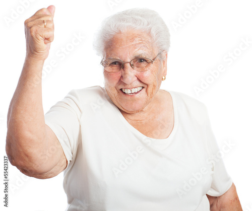 Elder woman celebrating something on a white background