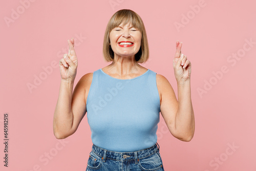 Elderly blonde woman 50s years old she wear blue undershirt casual clothes waiting for special moment, keeping fingers crossed, making wish, eyes closed isolated on plain pastel light pink background