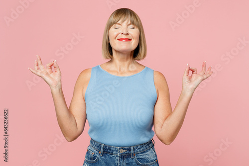 Elderly blonde woman 50s years old she wears blue undershirt casual clothes hold spreading hands in yoga om aum gesture relax meditate try to calm down isolated on plain pastel light pink background.