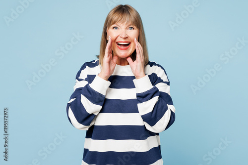 Elderly blonde woman 50s years old wear striped sweatshirt casual clothes scream sharing hot news about sales discount with hands near mouth isolated on plain blue cyan background. Lifestyle concept.