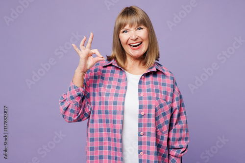 Elderly smiling happy blonde woman 50s year old wear violet shirt casual clothes show okay ok gesture look camera isolated on plain pastel light purple background studio portrait. Lifestyle concept