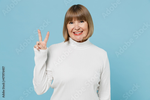 Elderly smiling satisfied cheerful fun cool caucasian woman 50s wearing white knitted sweater showing victory sign isolated on plain blue color background studio portrait. People lifestyle concept