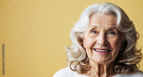 Elderly white woman with gentle expression and wavy blonde hair smiling soft yellow background