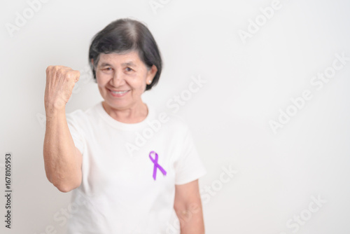 Elderly with Purple Ribbon for Violence, Pancreatic, Esophageal, Testicular cancer, Alzheimer, Epilepsy, Lupus, Crohn, Thyroid, Sarcoidosis and Fibromyalgia. Awareness month and World cancer day