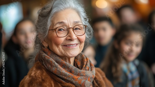 Elderly Woman Sharing Traditional Dance with Youthful Group in Warm Indoor Setting