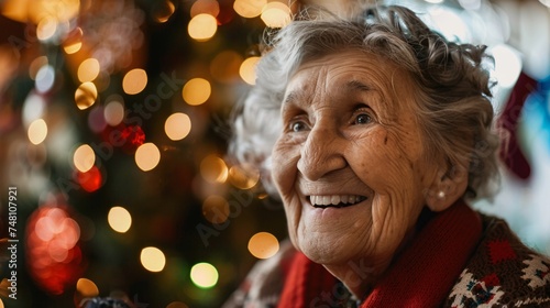 Elderly woman smiles as she receives a surprise visit from her family on Christmas morning
