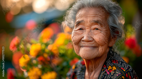 Elderly woman smiling in garden with vibrant flowers at sunset