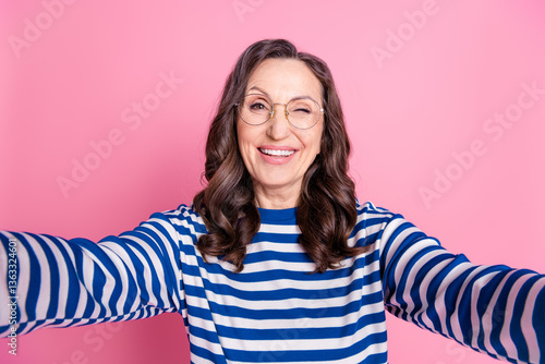 Elderly woman with glasses smiling warmly and posing in a striped pullover against a vibrant pink background