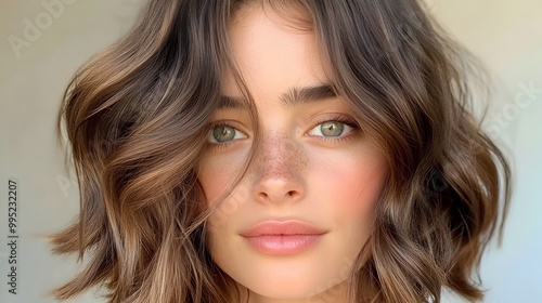 Elegant and modern shoulder length lob hairstyle featuring soft gentle waves and a middle part This feminine chic look showcases the beauty and style of women s fashion and personal grooming