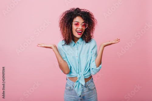 Elegant black woman in casual attire expressing surprised emotions in pink studio. Stunning short-haired girl posing in blue shirt.