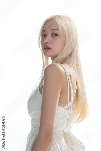 Elegant Blonde Woman in White Dress: A Serene Portrait