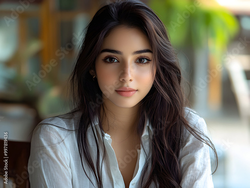 Elegant Blonde Woman Portrait in Natural Light with Serene Look Against Green Background