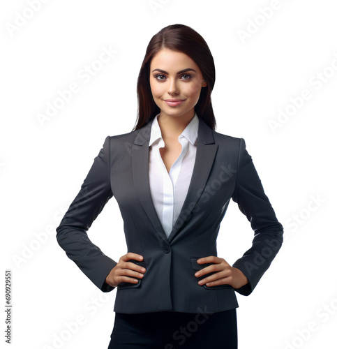 Elegant businesswoman standing confidently in a tailored grey suit. Generative AI