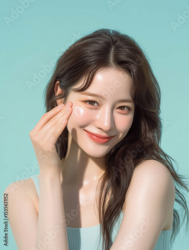 Elegant Korean beauty highlighting cheekbone in glowing skin studio session