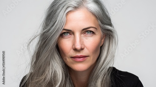 Elegant mature woman portrait. Silver hair, serene expression. Perfect for beauty, fashion, and lifestyle projects.