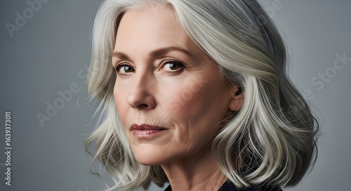 Elegant Mature Woman Silver Hair Professional Portrait Studio Shot Beauty Confidence Grey Hair Older Adult Female Model
