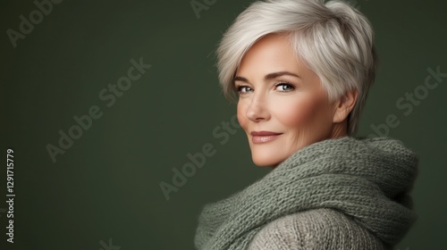 Elegant mature woman with short silver hair, wrapped in a cozy green shawl.