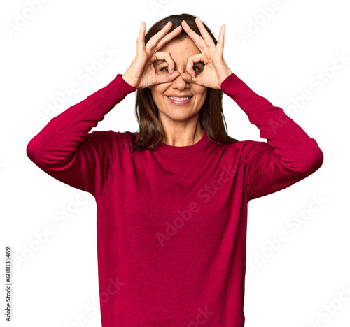 Elegant middle-aged Caucasian woman in studio setting showing okay sign over eyes
