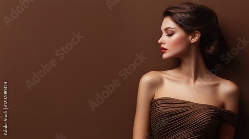 Elegant model poses with a graceful profile against a rich brown backdrop in a fashion shoot. Mocha Mousse trend color 2025