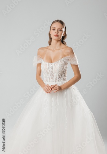 Elegant model showcasing a stunning white wedding dress with intricate lace details in a minimalist studio setting