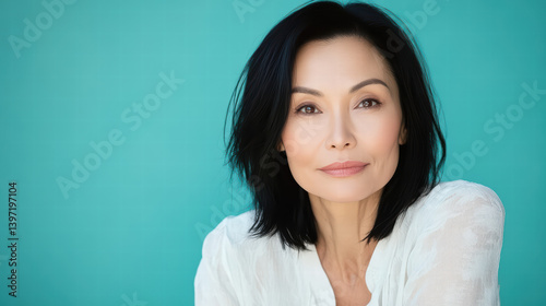 Elegant Portrait: A poised and confident woman with a serene expression gazes directly into the camera, her gaze evoking a sense of tranquility. She exudes an aura of timeless beauty and grace.