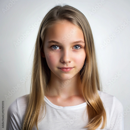 Elegant Portrait of a Teenage Girl with Long Blonde Hair and Clear Blue Eyes in a Minimalistic Setting