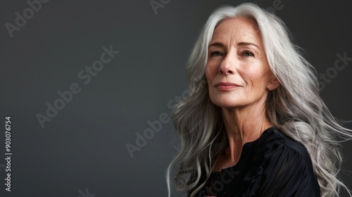 Elegant portrait of an older woman with long silver hair against a dark background. This fine art style image captures wisdom and confidence. Perfect for stock imagery on age and beauty. AI
